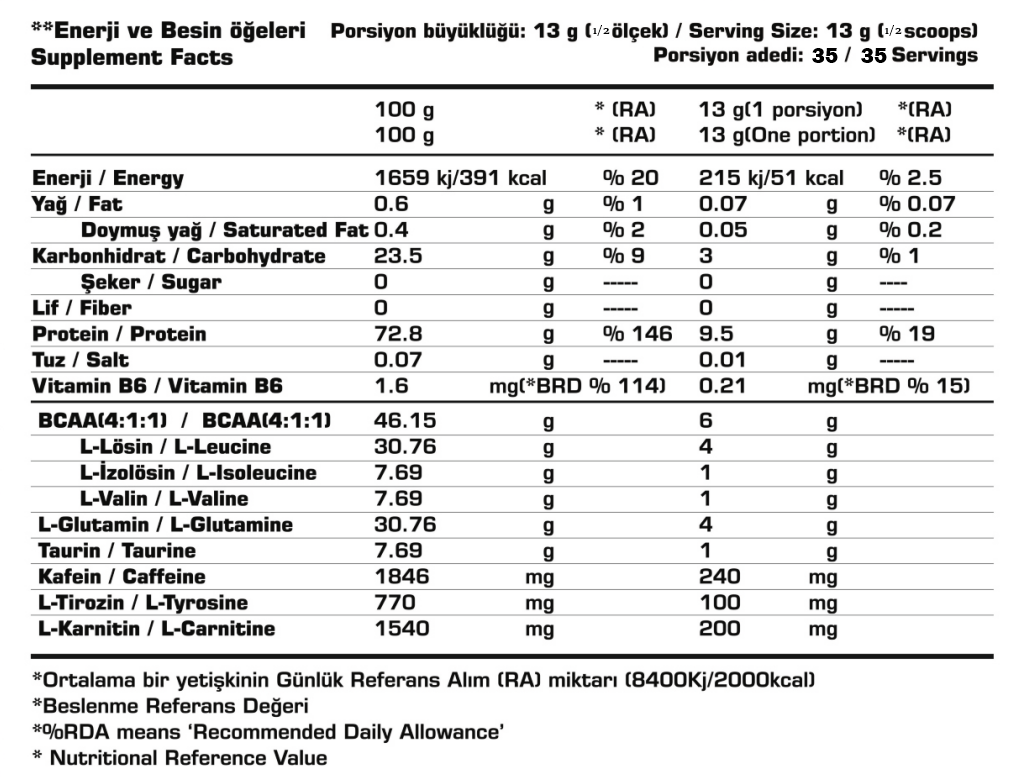 İçeriğinde yüksek miktarda BCAA bulunduran, L-glutamin, taurin, tirozin, kafein ve vitaminlerle zengileştirilmiş olan bu ürün beslenme ihtiyacını karşılamaya, yoğun fiziksel aktivite dönemlerinde aminoasit dengesini korumaya ve antrenman performansını geliştirmeye yardımcı olur. Kaslarınızı onararak rejenerasyon sağlar ve toparlanma sürecini hızlandırır. İçeriğindeki termojenik bileşenler sayesinde yağ yakımını hızlandırır ve enerjinizi yükseltir.