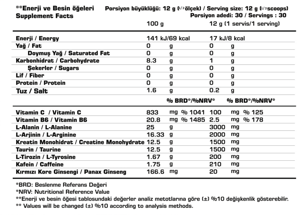 Gorilla Performance Pre-Workout Enerji Besin Öğeleri Tablosu